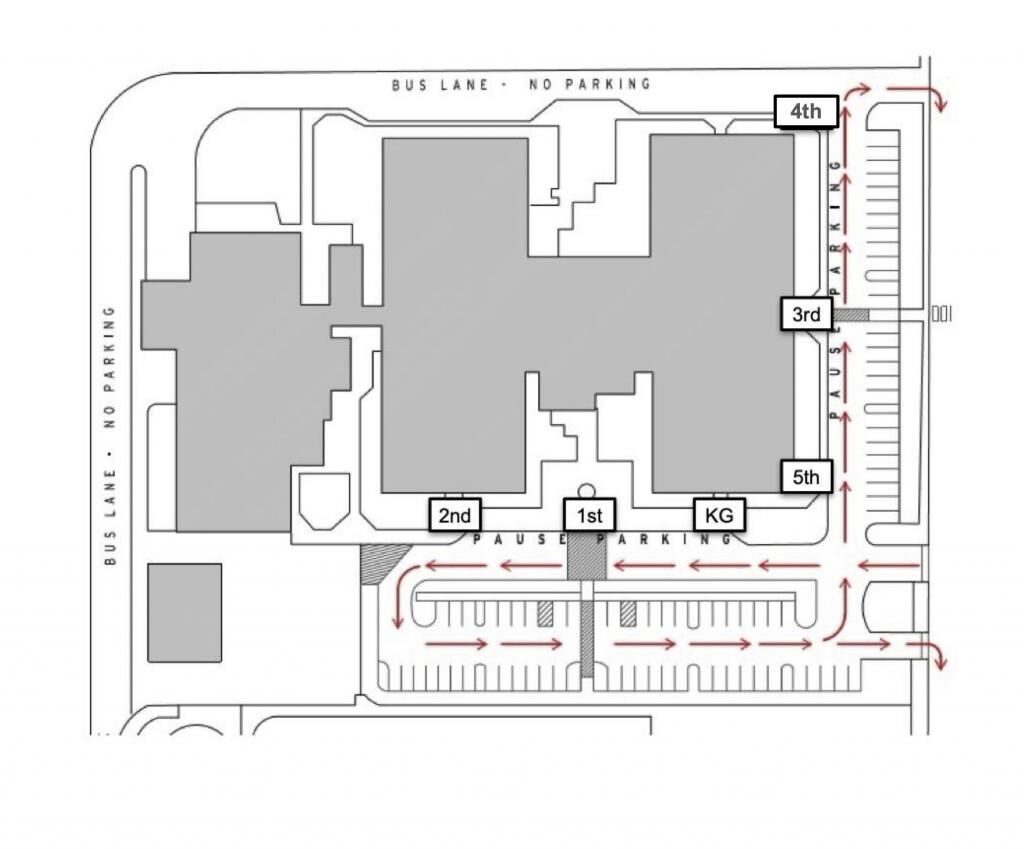 KG: D Wing Entrance (Front of School) 1st Grade: D Entrance Door (Front of School) 2nd Grade: C Wing Entrance (Gym/Cafeteria Entrance) 3rd Grade: B Wing Entrance (East Side of School) 4th Grade: B Wing Entrance (East Side of School) 5th Grade: A Wing Entrance (Front of School)