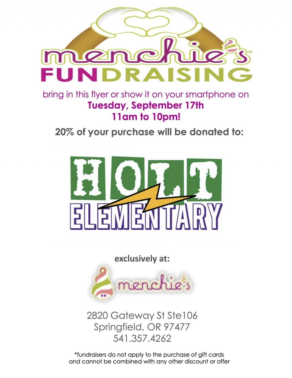 Tuesday, Sept 17th, 12:00-10:00 is a Holt Night Out Fundraiser at Menchie's Frozen Yogurt. Located at Gateway Mall, all you need to do is bring the Fundraiser Flyer or show the flyer on your smartphone, and 20% percent of your purchase will go to Holt!