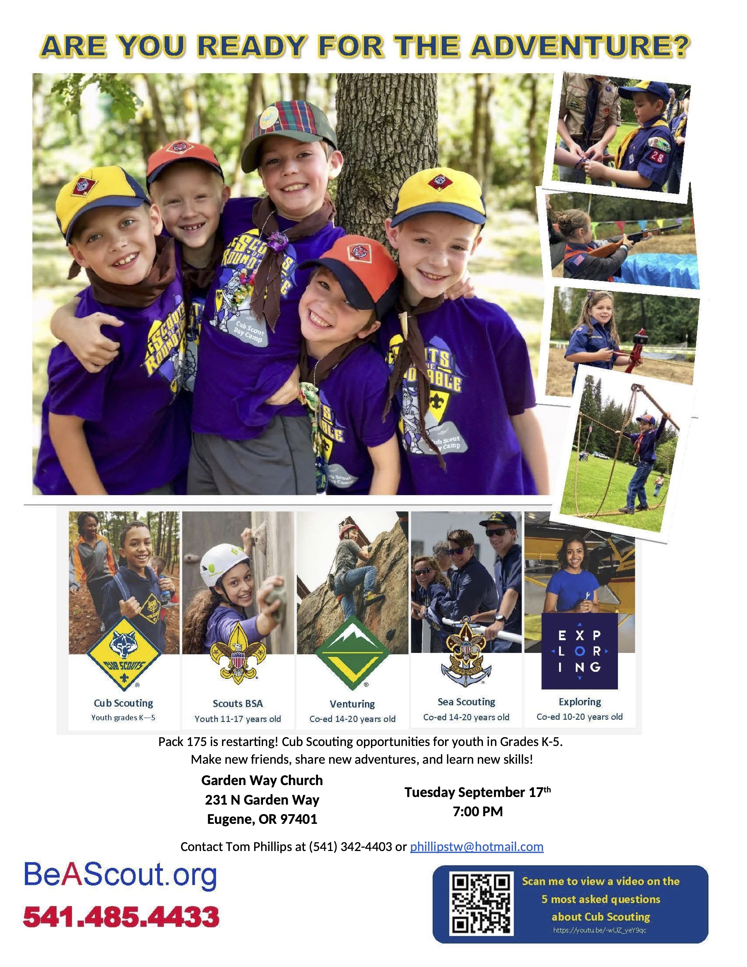 Pack 175 is restarting. Cub Scouting opportunities for youth in Grades K-5 to make new friends, share new adventures, and learn new skills! Come to Garden Way Church 231 N Garden Way on Tuesday, September 17th, at 7:00 PM. Contact Tom Phillips at (541) 342-4403 or phillipstw@hotmail.com with any questions.