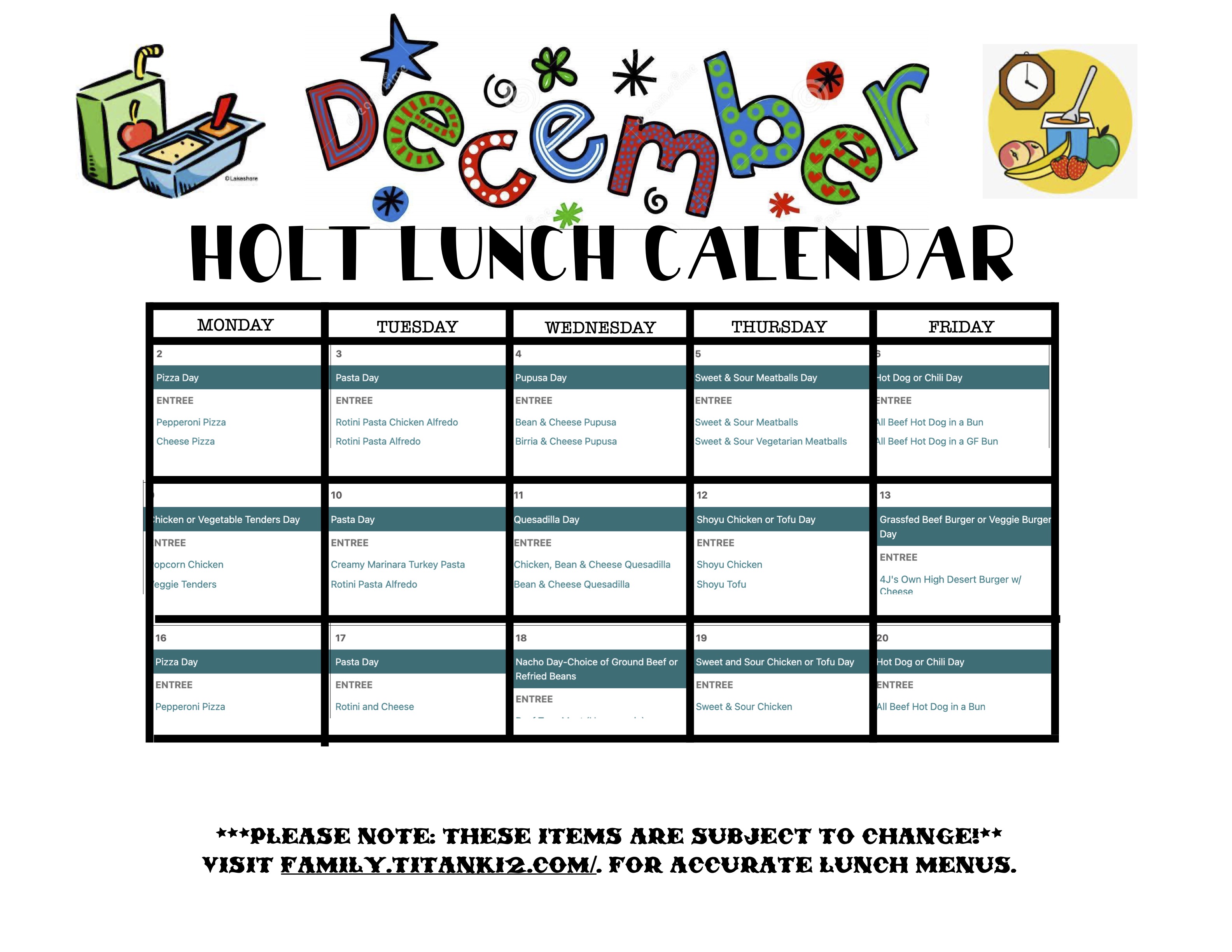 Breakfast and lunch menus are available on the 4J Menu Website. Make sure you filter to Holt Elementary.