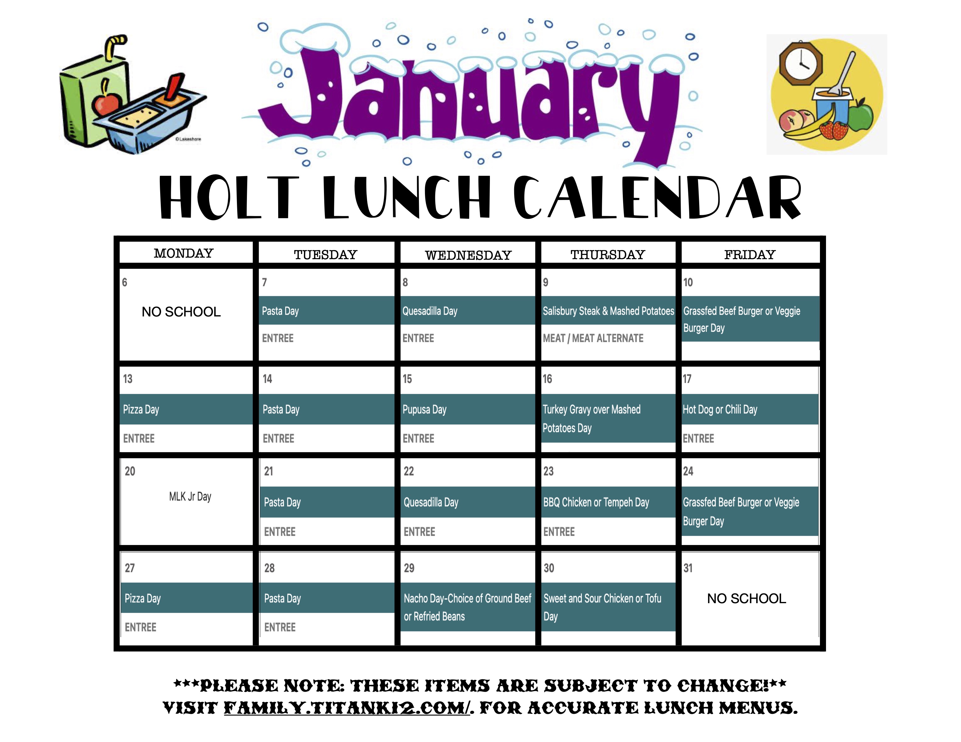 Breakfast and lunch menus are available on the 4J Menu Website. Make sure you filter to Holt Elementary.