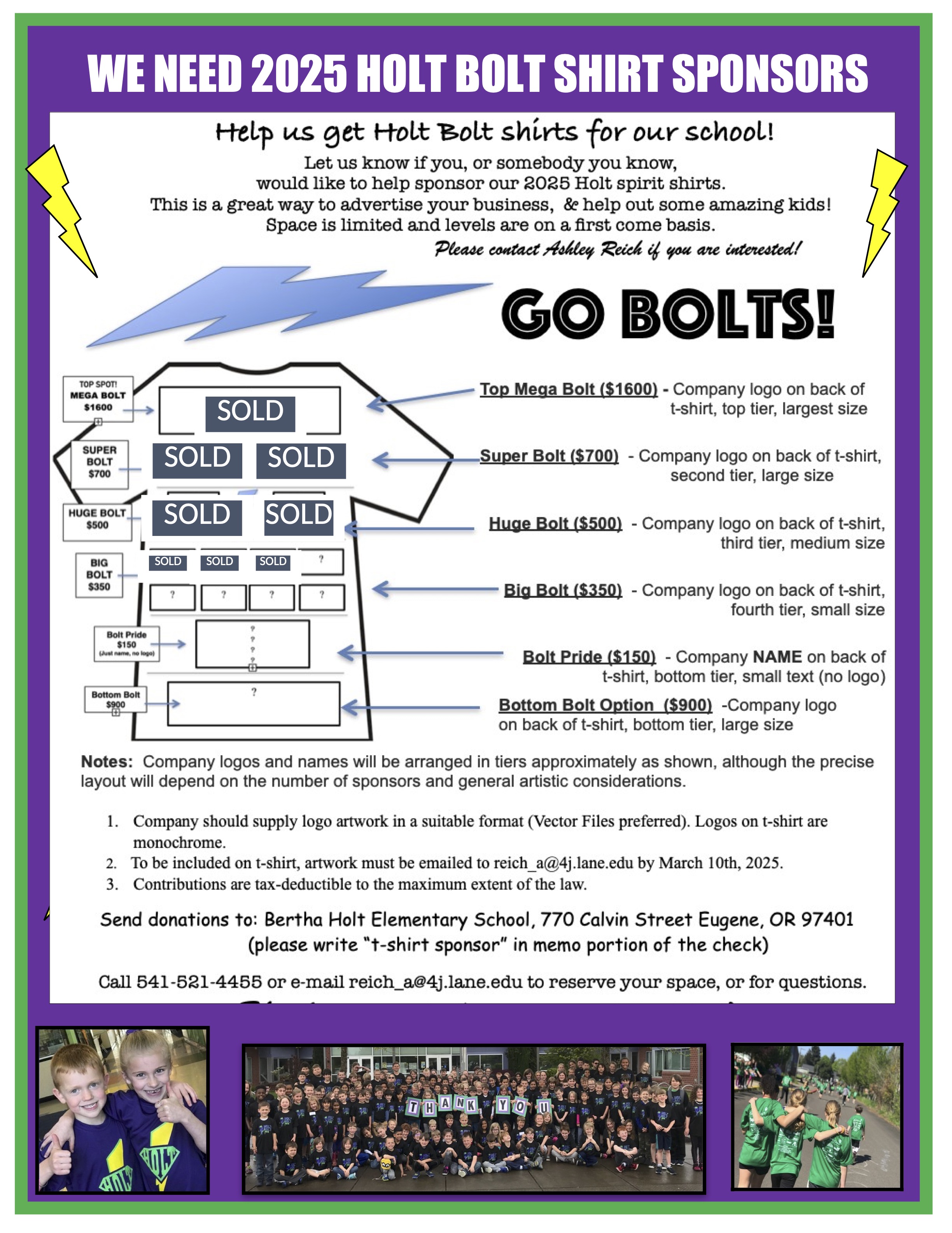 We are still in need of some Holt Bolt shirt sponsors! We have the "Bottom Bolt" spot and several "Big Bolt" sponsorships available. Let Ashley Reich know if you are interested by email at reich_a@4j.lane.eduLooking for a fun way to be a part of the shirts? The "Bolt Pride" spots can be used for business names or shoutouts! For example, "In Honor of Bob" or "Electra Rocks". Every "Bolt Pride" slot filled will allow us to purchase over 20 shirts for a Holt kid! Every bit helps!
