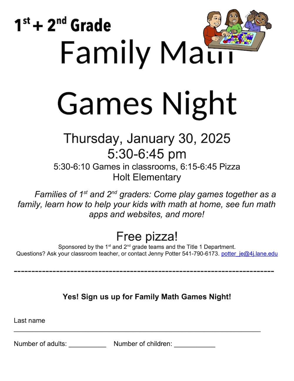 1st & 2nd Grade Family Math Games Night THIS THURSDAY, 5:30-6:45 pm