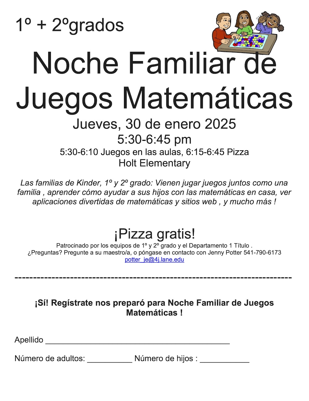1/29, 6:00-7:30, Conscious Discipline Parent Education Series (Library) 1/30, 5:30-6:45, 1st & 2nd Family Math Night (Classrooms) 1/31, No School – Semester Grading Day 2/3, No School – Transition Day 2/4, 5:30-7:00, Bertha's Birthday Bingo Bash & Silent Auction (Cafeteria) 2/4, 5:30-7:00, Bike Fix-It Event (Gym) 2/5, Monthly Walk & Roll to School Day 2/5, 6:00-7:30, Conscious Discipline Parent Education Series (Library) 2/6, 6:00-7:00, Accessible Education Parent Group (Library) 2/8, 9:00-11:30, Free Clothes, Shoes, & Coats (1855 Cal Young Rd) 2/12, 5:00-6:00, Site Council (Library) 2/12, 6:00-7:00, PTO Meeting (Library) 2/14, Holt Friendship Day 2/13, 1:00-3:00, Food and Clothing Distribution (Sheldon Community Center) 2/17, No School - Presidents Day (possible school closure makeup day) 2/19, 6:00-7:30, Conscious Discipline Parent Education Series (Library)