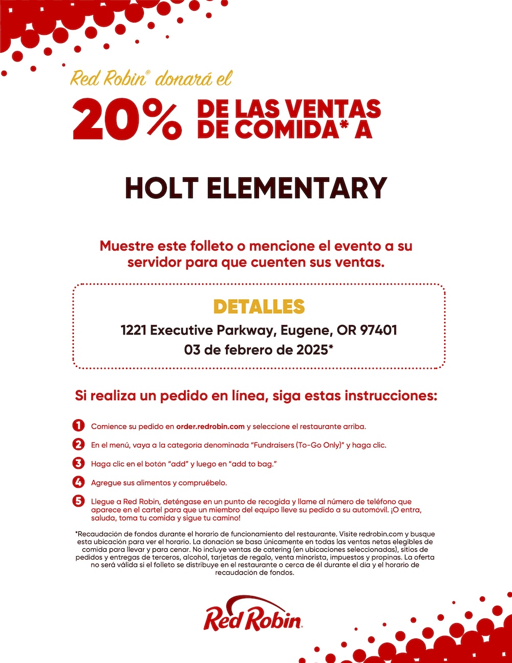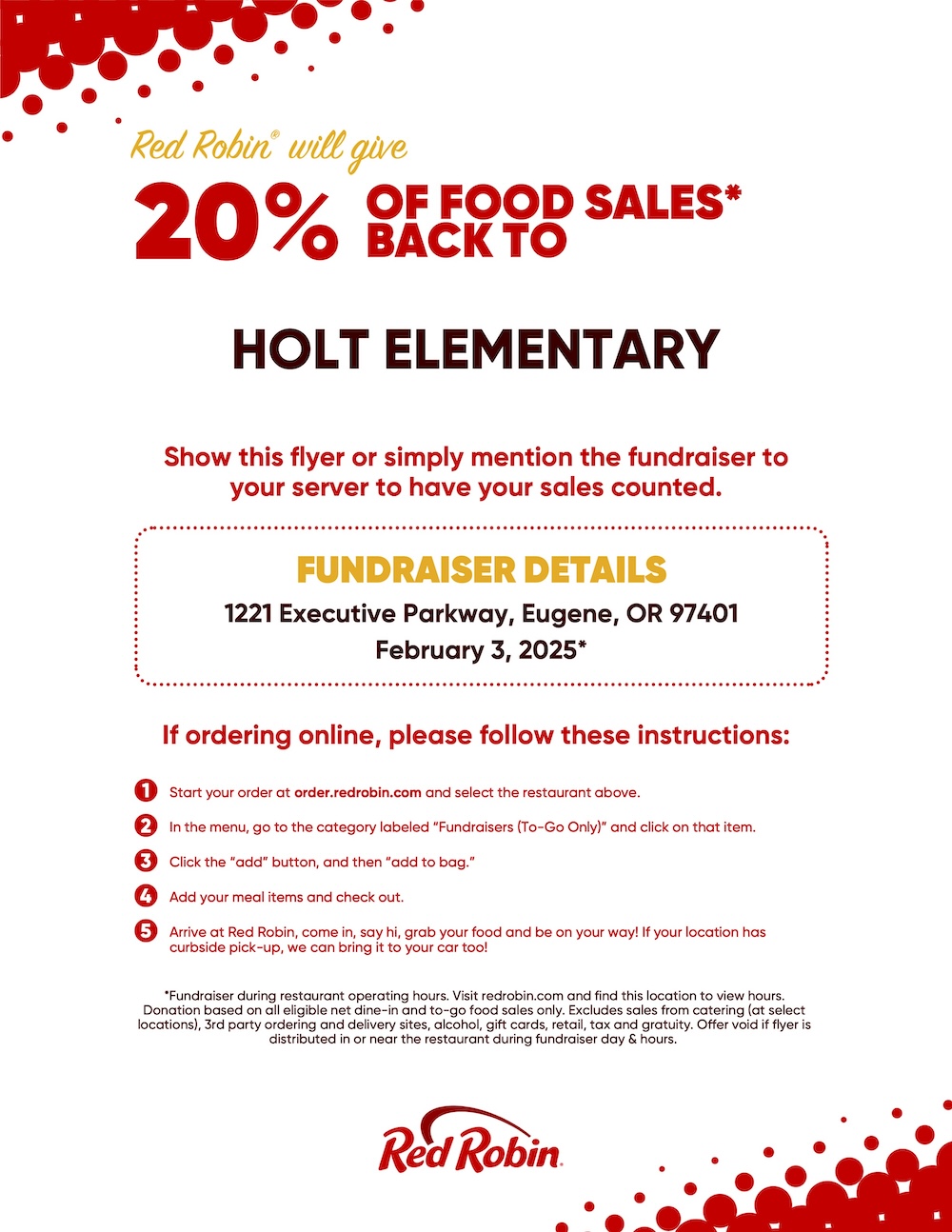 Don't want to cook? Head over to Red Robin at Valley River on Monday, February 3rd, and 20% of fundraiser sales* will come back to Holt Elementary PTO. Show the flyer below to your server at this Red Robin location, or order online at redrobin.com or on the Red Robin mobile app. For online and mobile app orders you must add the fundraiser to your cart before you check out for the sales to count towards the fundraiser.