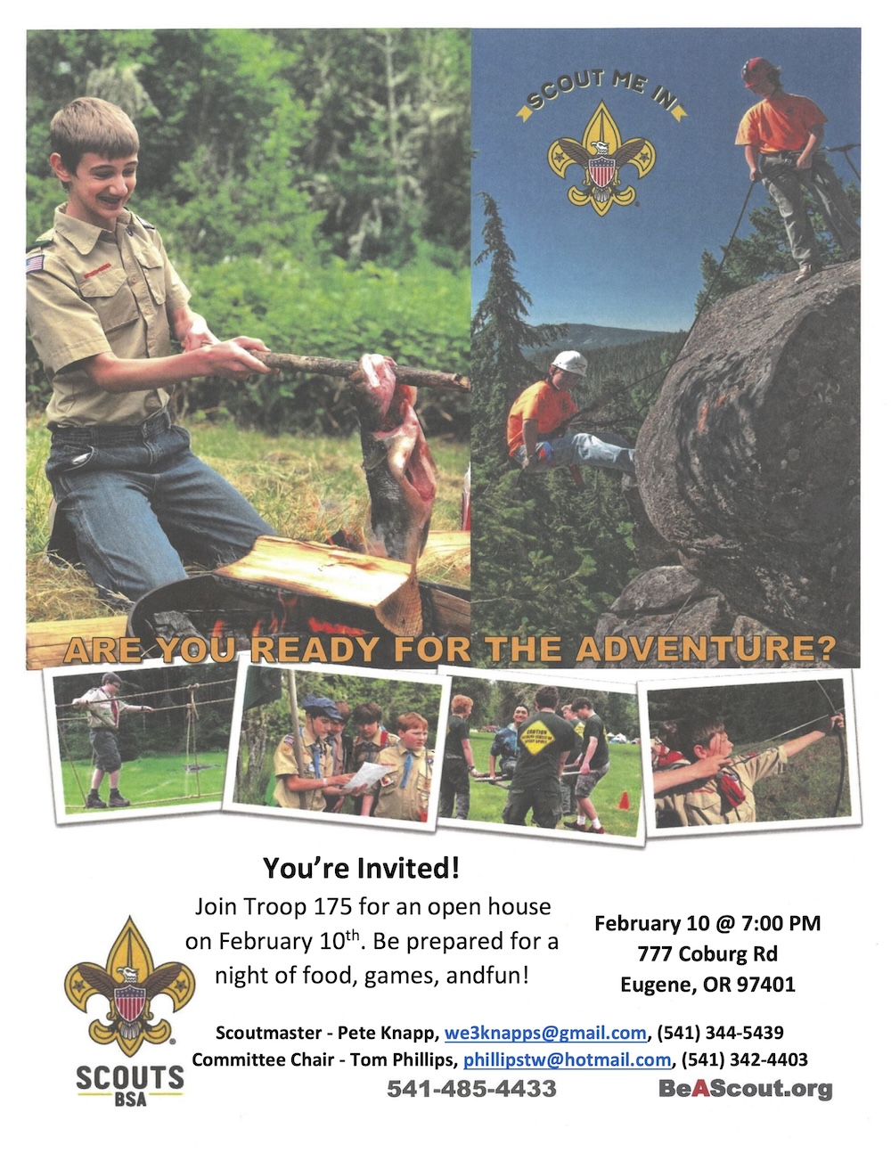 Attention, 5th graders! Come to the Scouts open house on Feb 10 at 7 pm at Westminster Presbyterian Church on 777 Coburg Rd. There will be food, games and fun.