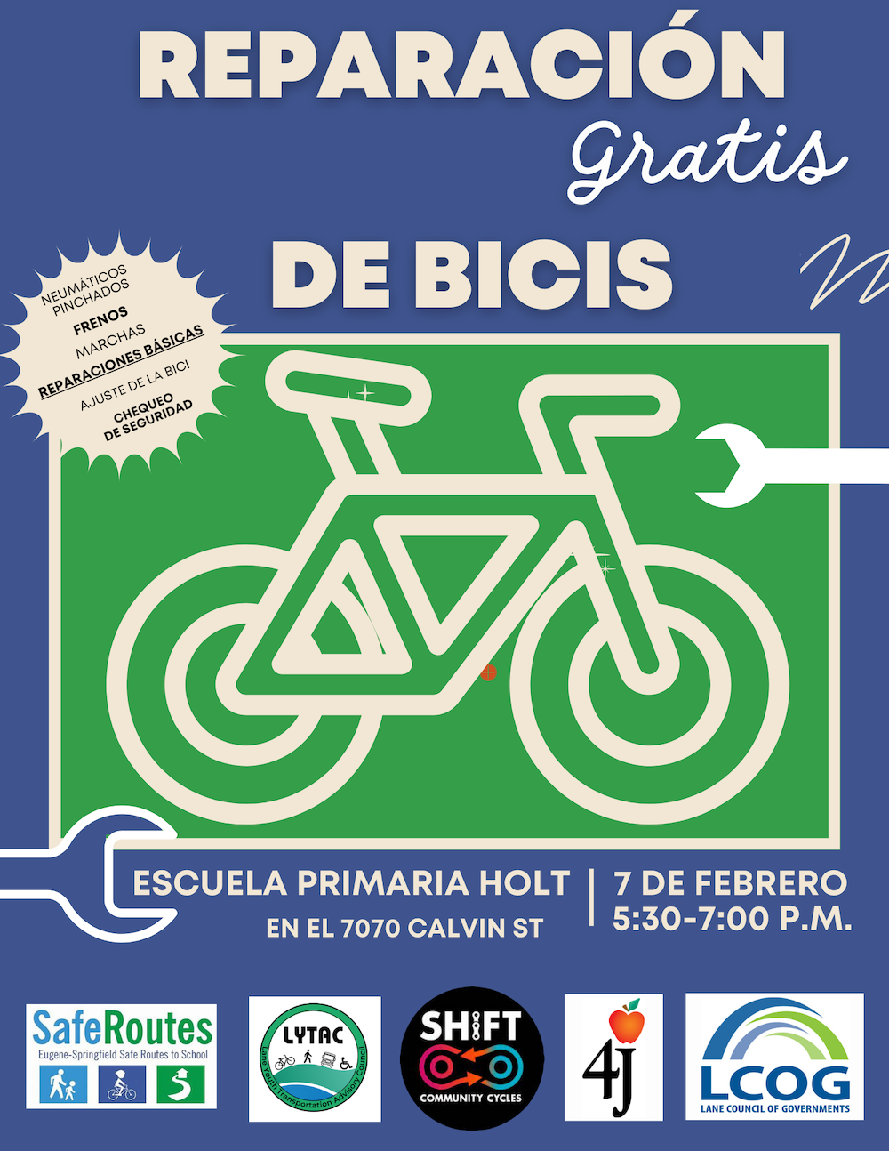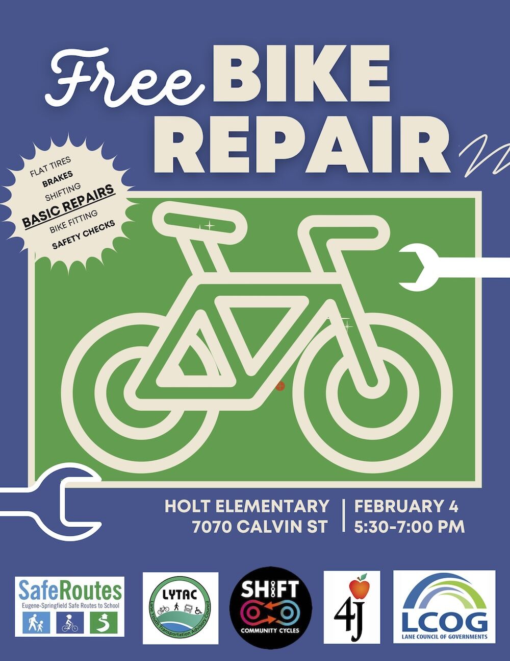 2/3, No School – Transition Day 2/4, 5:30-7:00, Bertha's Birthday Bingo Bash & Silent Auction (Cafeteria) 2/4, 5:30-7:00, Bike Fix-It Event (Gym) 2/5, Monthly Walk & Roll to School Day 2/5, 6:00-7:30, Conscious Discipline Parent Education Series (Library) 2/6, 6:00-7:00, Accessible Education Parent Group (Library) 2/8, 9:00-11:30, Free Clothes, Shoes, & Coats (1855 Cal Young Rd) 2/12, 5:00-6:00, Site Council (Library) 2/12, 6:00-7:00, PTO Meeting (Library) 2/14, Holt Friendship Day 2/13, 1:00-3:00, Food and Clothing Distribution (Sheldon Community Center) 2/17, No School - Presidents Day (possible school closure makeup day) 2/19, 6:00-7:30, Conscious Discipline Parent Education Series (Library) 2/22, 10:00-1:00, 6th Annual UO Math Festival (Mac Court)
