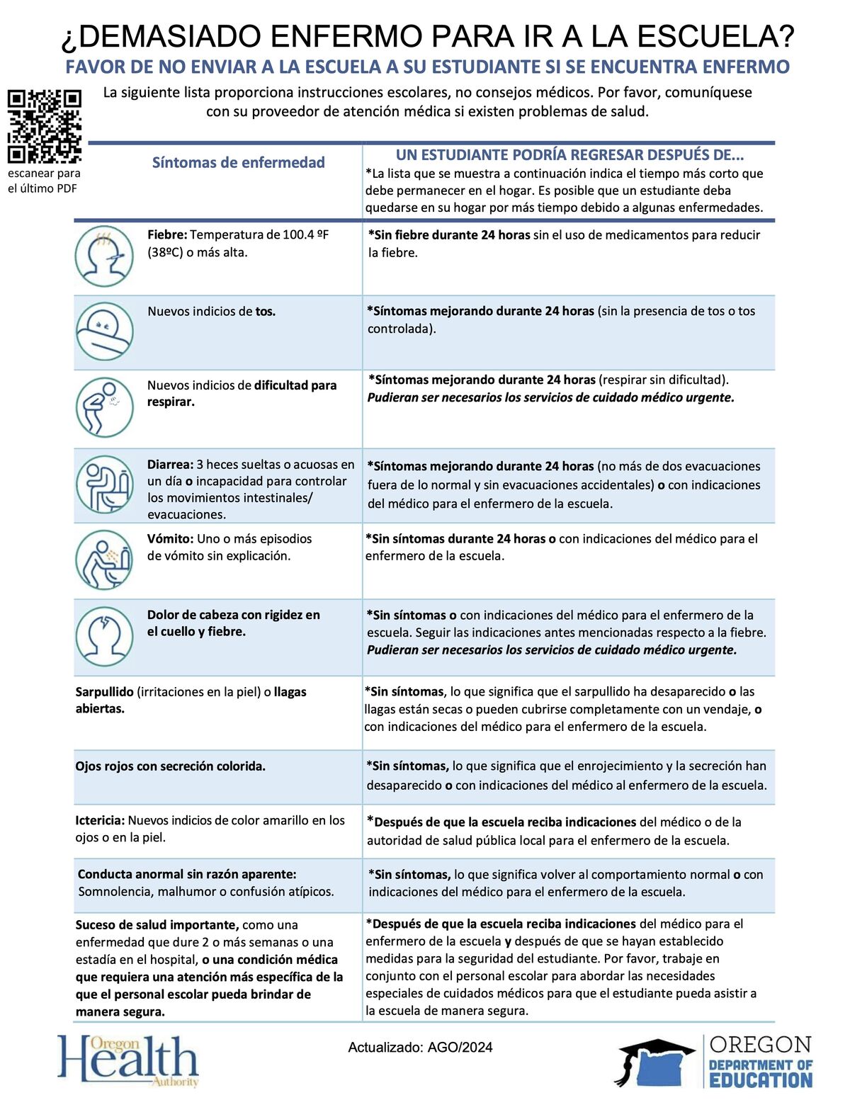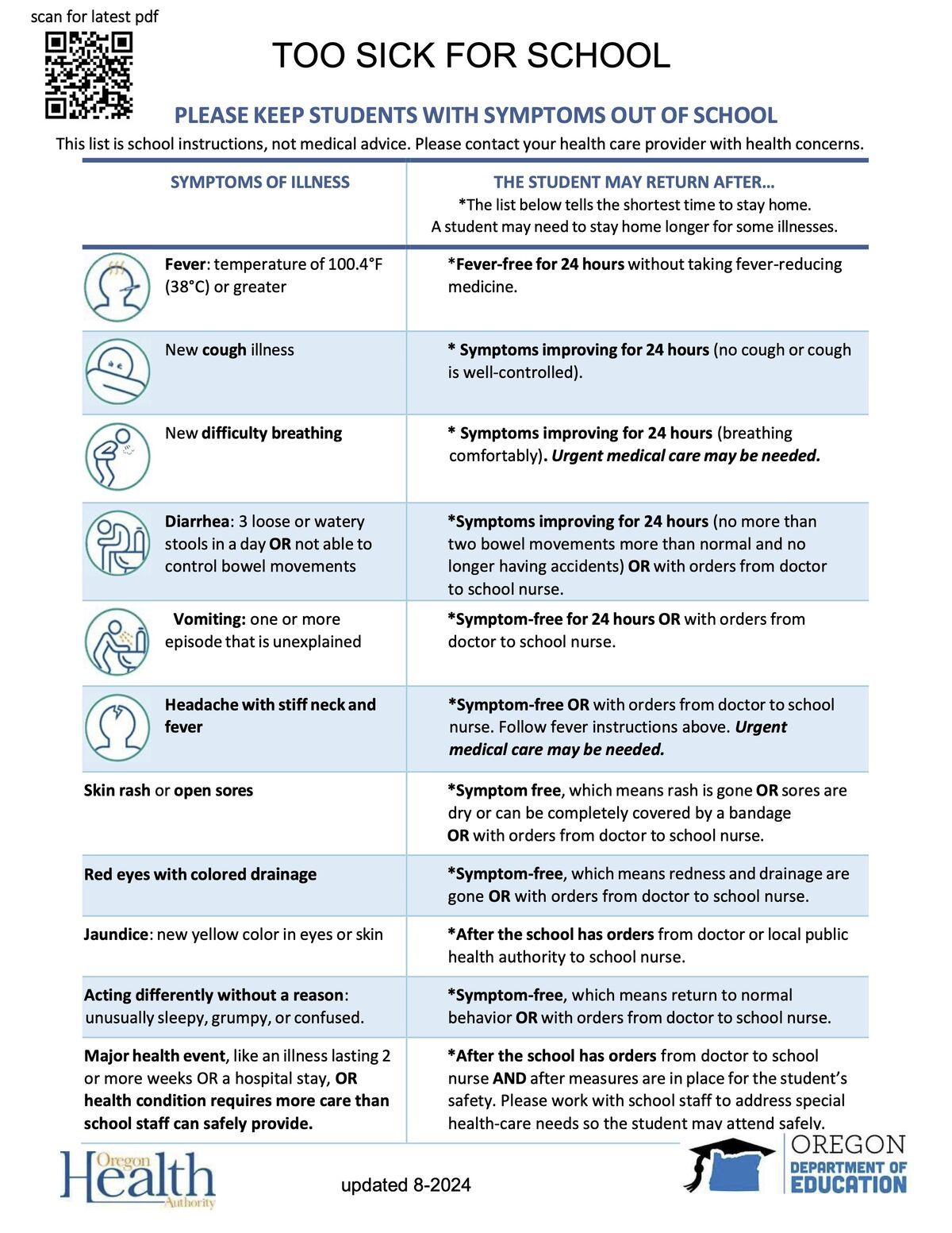 Too Sick For School? In the school setting, contagious diseases can easily spread among students. Please keep students with the following symptoms out of school: