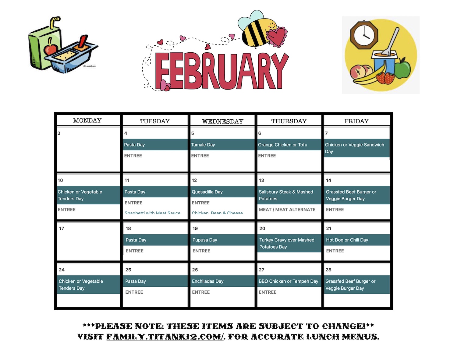 Breakfast and lunch menus are available on the 4J Menu Website. Make sure you filter to Holt Elementary.