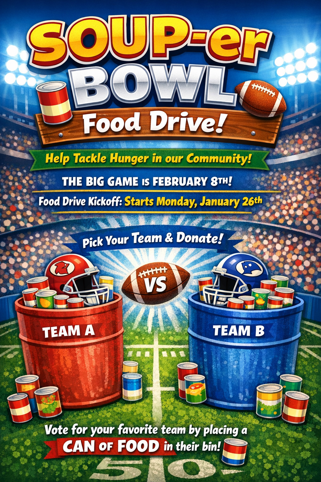 - Soup-er Bowl Food Drive: Donate canned food Jan. 26-Feb. 8