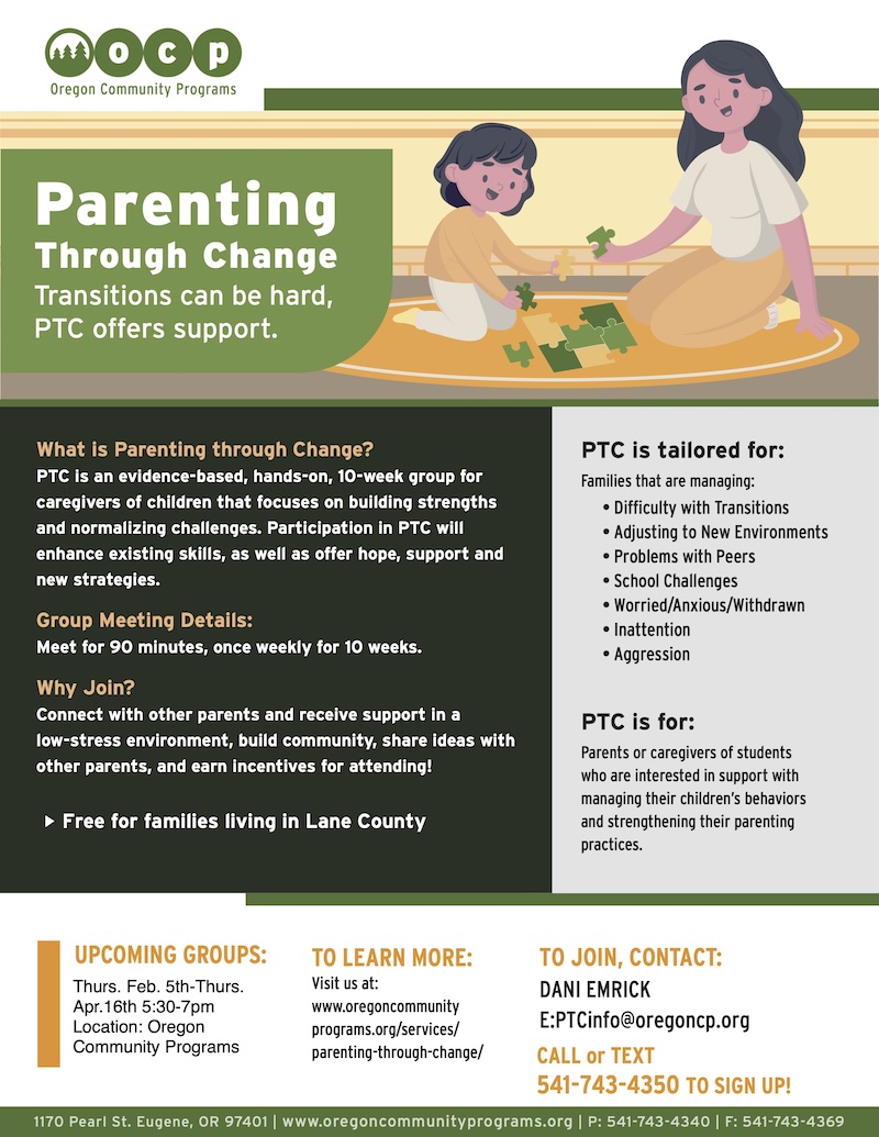 El Página de recursos de la familia Holt Enumera recursos comunitarios y estatales, incluyendo consejeros en Eugene con vacantes. Para este mes, incluyen:- Arise Counseling tiene 10 vacantes.