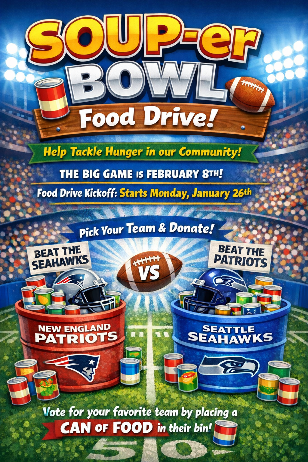 Help Tackle Hunger in our Community! The big game is Feb. 8, and the Food Drive Kickoff starts Monday, Jan. 26th. Vote for your favorite team by placing a can of food in their bin!