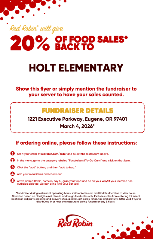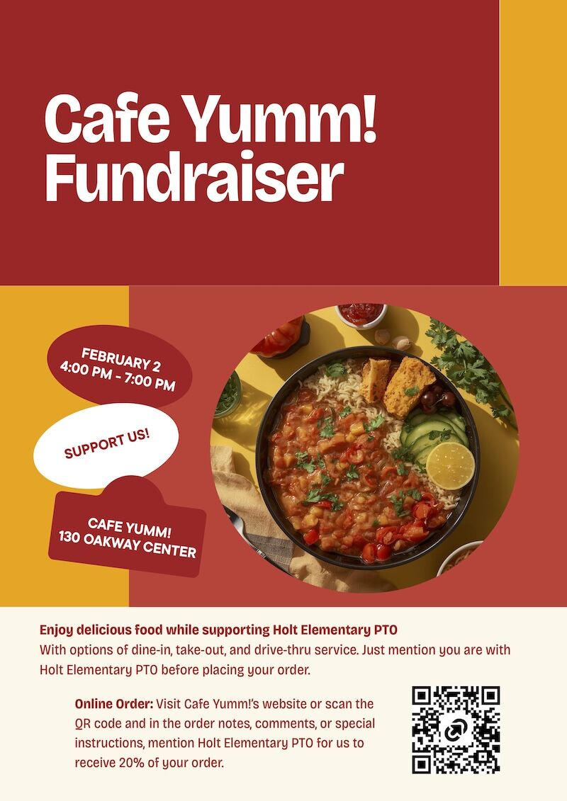 Join us for a Cafe Yumm fundraiser on February 2 from 4:00–7:00 PM at 130 Cafe Yumm, Oakway Center—dine-in or take-out, and don’t forget to mention Holt Elementary PTO (or add it in online order notes) so the PTO receives 20% of your purchase.5th Grade Outdoor School Info & Activity Night, Feb. 12 @6:00