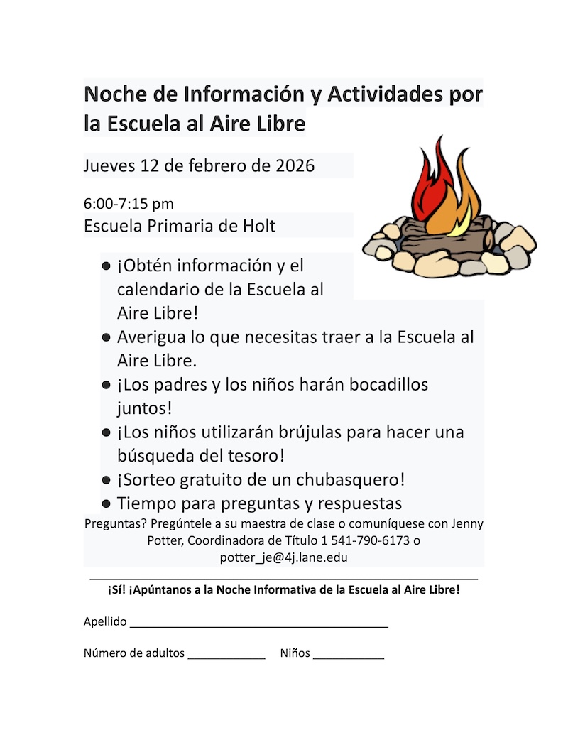 INFORMACIÓN CORREGIDA: ¡Anoten en sus calendarios la Noche de la Escuela al Aire Libre para 5.º grado! Será este jueves a las 6:00. Los adultos se reunirán en la biblioteca con el personal de la escuela y del campamento para conocer el programa y obtener respuestas a todas sus preguntas. Los estudiantes se reunirán en la cafetería para realizar una actividad de enriquecimiento con el personal de Holt Title 1. Hagan clic en el folleto de arriba para obtener más detalles. La Escuela al Aire Libre de este año será del 29 de abril al 1 de mayo. ¡Sin mensajes de último minuto para los estudiantes!