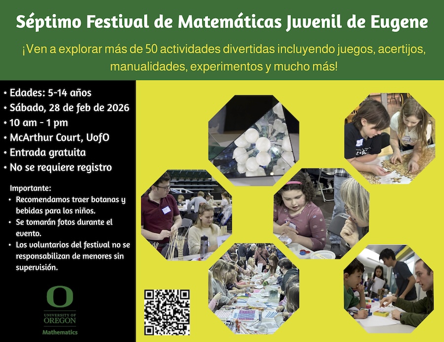 Únase a nosotros para el sexto Festival Anual de Matemáticas para Jóvenes de Eugene el sábado 28 de febrero, de 10 a. m. a 1 p. m. en McArthur Court (Universidad de Oregon, 1601 University St.), donde los niños de 5 a 14 años (acompañados por un adulto) pueden explorar más de 50 estaciones prácticas de matemáticas, gratis, sin necesidad de registrarse, con estudiantes hispanohablantes de la UO disponibles para ayudar.¡Evita la fila para recoger a tus hijos del colegio!