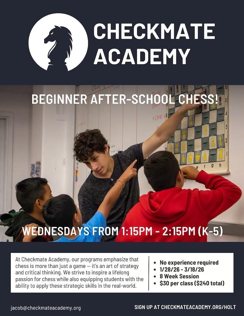 En la Academia Checkmate, un nuevo club de ajedrez extraescolar comienza el 11 de febrero y se extenderá hasta el 26 de marzo. Las clases son los miércoles después de clases, de 13:15 a 14:15, en el aula B-1. $30 por clase. ¡Inscríbete aquí!