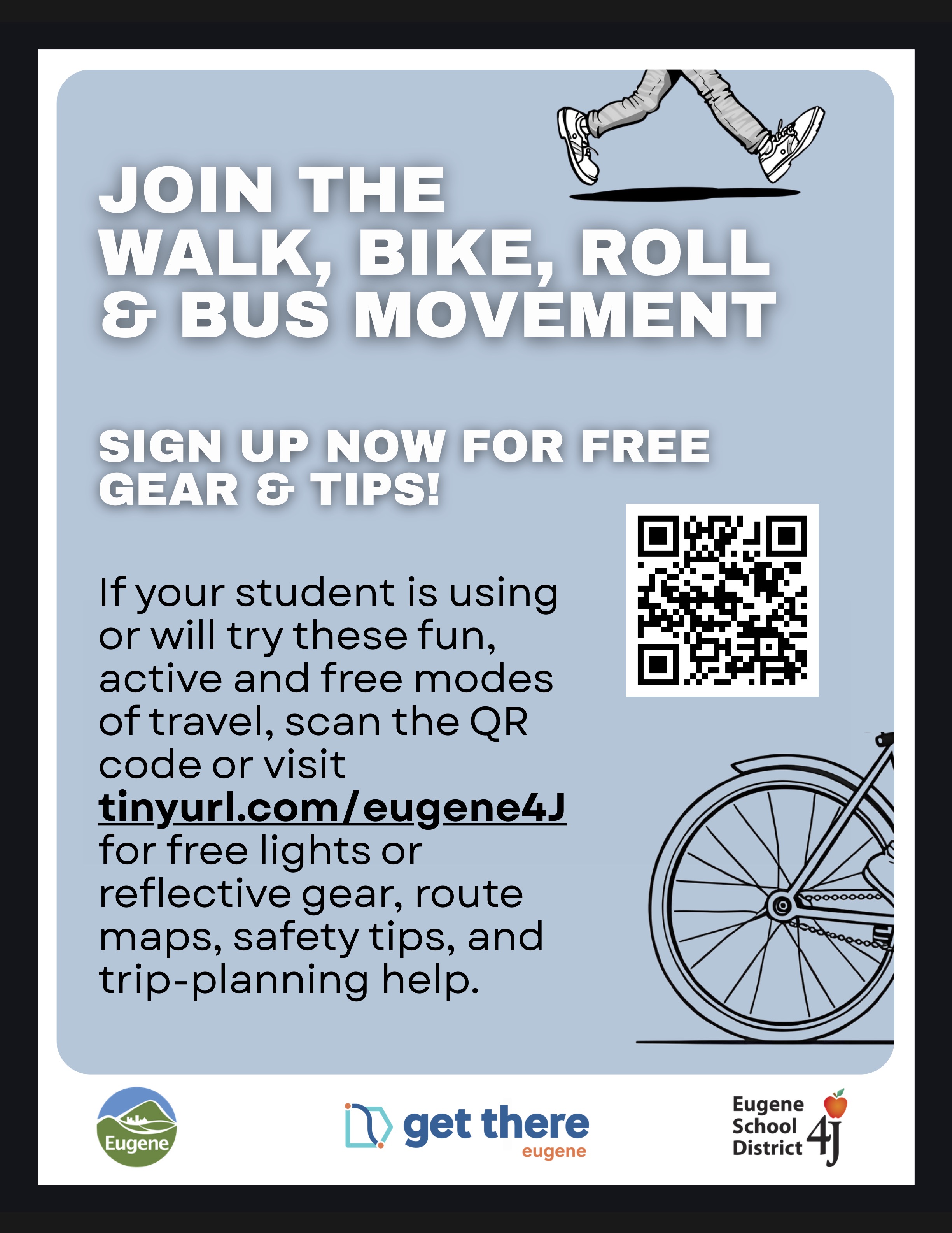 Rutas Divertidas y Activas a la Escuela ayuda a las familias de primaria a encontrar maneras fáciles y seguras de caminar, andar en bicicleta, patinete o ir en autobús. Además, recibirás obsequios, consejos sobre rutas y apoyo local. ¡Regístrate en tinyurl.com/eugene4j y prueba una nueva forma de ir a la escuela!Concurso de diseño de productos para estudiantes (inicia el 2 de febrero)