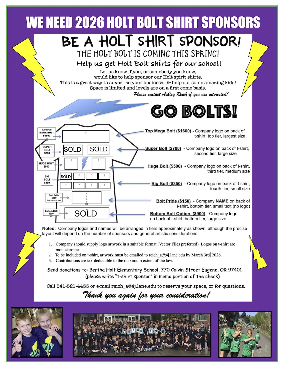 The Holt Bolt is coming soon! Help us get Holt Bolt jog-a-thon shirts for our school by becoming a shirt sponsor. See the Sponsor Flyer for details! Space is limited, and levels are on a first-come, first-served basis. If you, or someone you know, would like to help sponsor our 2026 Spirit Shirts, contact Ashley Reich at reich_a@4j.lane.eduBe an Educational Assistant Sub at Holt!