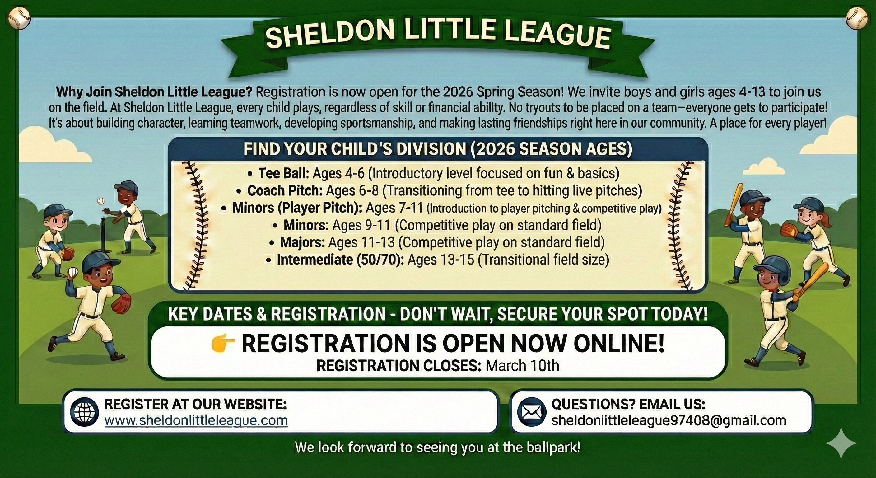 Unity School is excited to announce open enrollment for its K-4 after-school program, which provides convenient morning care and drop-off as well as afternoon pickup for students. Interested families are encouraged to call 541-484-0107 to schedule a tour and learn more about the program.Sheldon Little League Registration