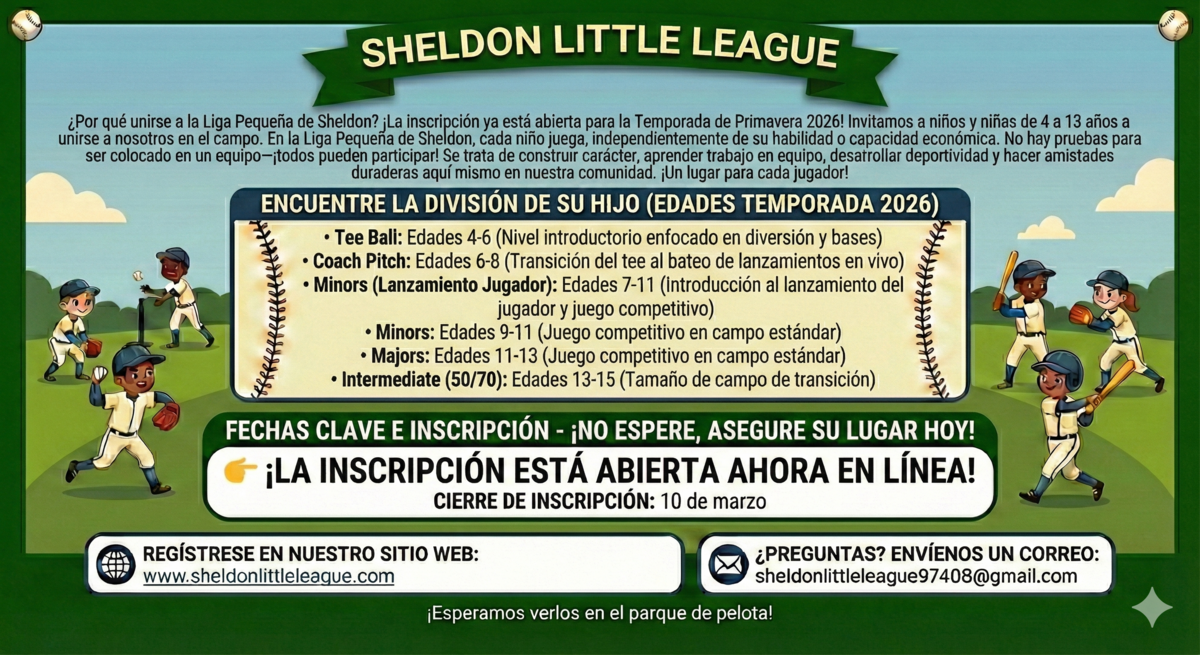Llamado a todos los jugadores de béisbol de 4 a 13 años en Eugene: la inscripción está abierta para la temporada de primavera de 2026 de Sheldon Little League, donde todos los niños juegan (sin pruebas), hay becas disponibles y los niños desarrollan habilidades, espíritu deportivo y amistades duraderas en una comunidad inclusiva.Distribución de despensa móvil de alimentos, VIERNES