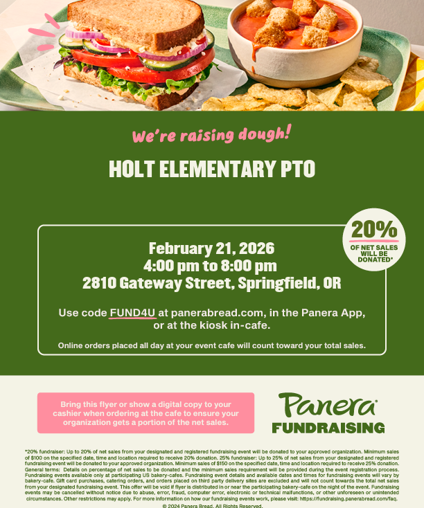 Este sábado, de 16:00 a 20:00, habrá una Noche de Holt en Panera para recaudar fondos. Pide en línea con el código FUND4U entre las 16:00 y las 20:00 o lleva/muestra este folleto al cajero para que la escuela reciba hasta el 20% de las ventas.Se necesitan voluntarios