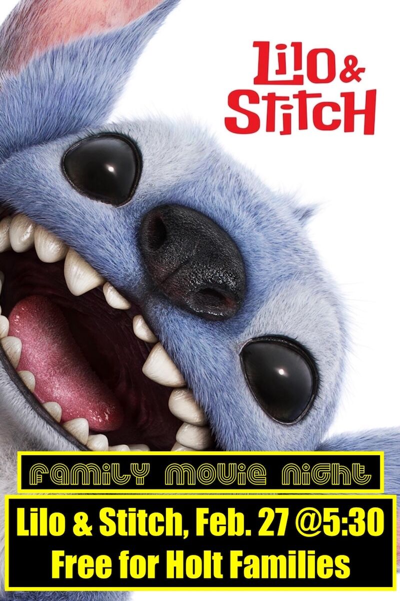 Join us for Family Movie Night featuring Lilo & Stitch on February 27th at Holt Elementary from 5:30–7:30 PM, with doors opening at 5:00 PM for our FREE event just for Holt families! Enjoy FREE popcorn, a book fair, and concessions (candy, soda, and water) available for purchase, and be sure to visit Kona Ice starting at 5:00 PM to buy delicious shave ice while you watch the movie from 5:30–7:10 PM.Report Absences by 8:15 AM