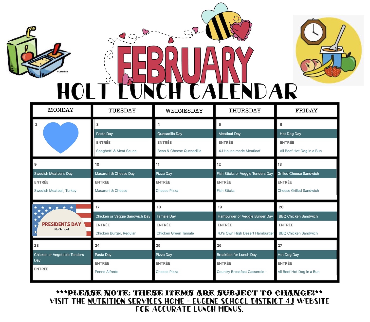Breakfast and lunch menus are available on the 4J Menu Website. Make sure you filter to Holt Elementary.
