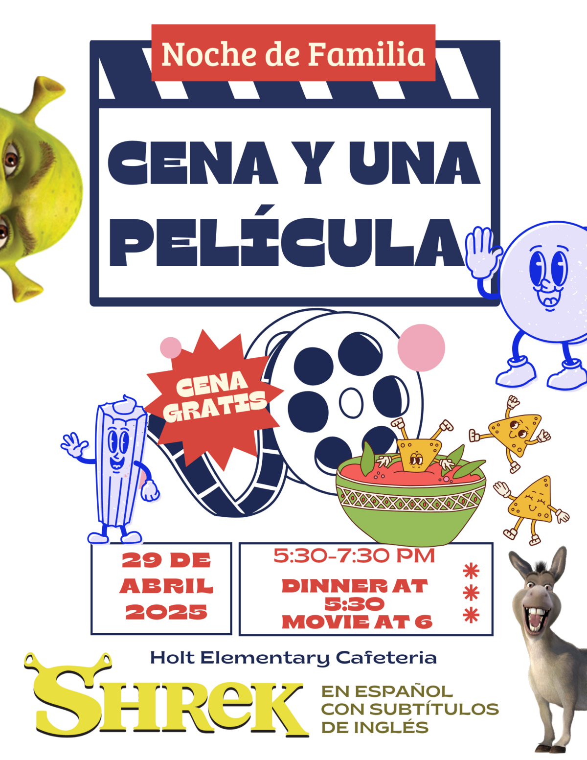 • Noche de Familia, CENA Y UNA PELÉCULA, MARTES: Shrek en español con subtítulos en inglés se proyectará en la cafetería Holt el 29 de abril, de 5:30 a 7:30.