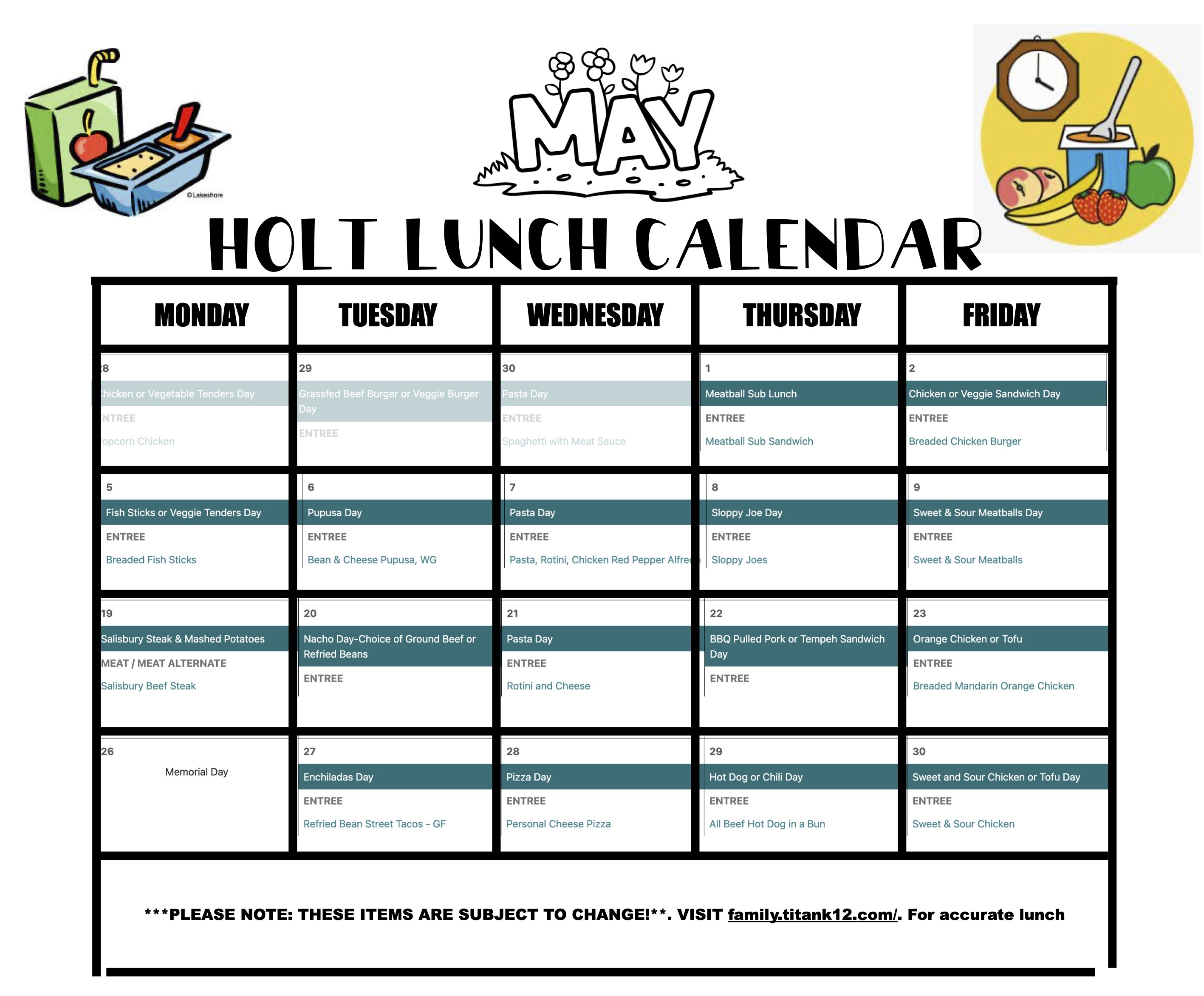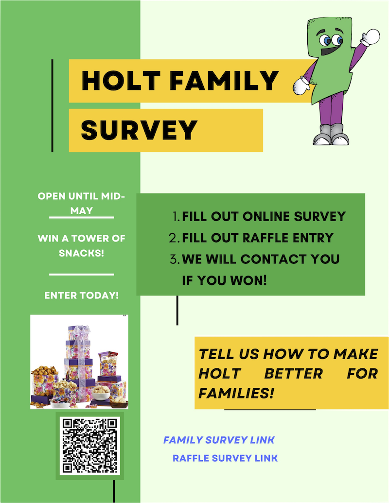 Teacher & Staff Appreciation Week, May 5-9:  The PTO is celebrating all our hard-working staff at Holt during National Teacher Appreciation Week. Sign up HERE to bring something or donate to the event.