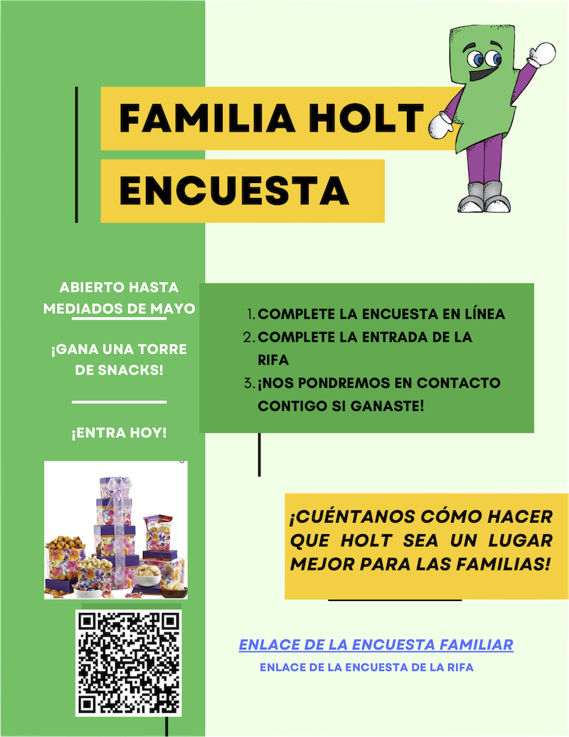 Semana de agradecimiento a los maestros y al personal, del 5 al 9 de mayo: La PTO está celebrando a todo nuestro personal trabajador en Holt durante la Semana Nacional de Agradecimiento a los Maestros.   Regístrate AQUÍ para traer algo o donar al evento.