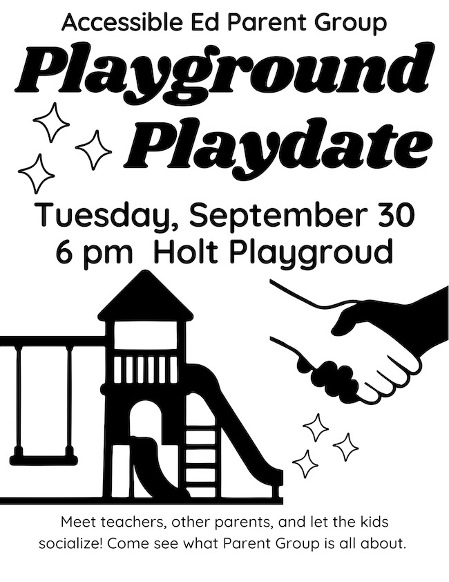 Nuestro primer Grupo de Padres de Educación Accesible se reunirá el martes a las 6:00 p. m. en el patio de juegos de Holt (nos trasladaremos al interior si llueve). Este grupo está abierto a todos los padres, pero es específicamente para padres de estudiantes con IEP, servicios de logopedia, planes 504 u otras dificultades de aprendizaje. Consulte el folleto para obtener más información.