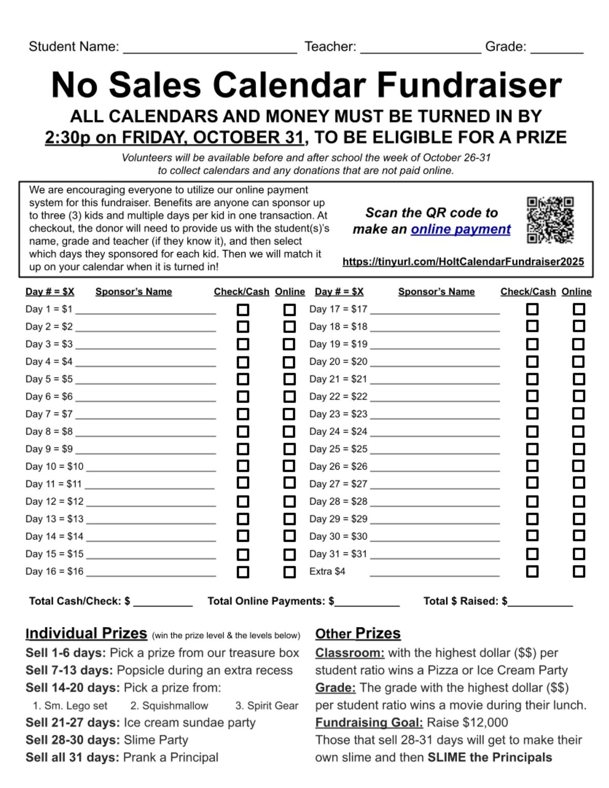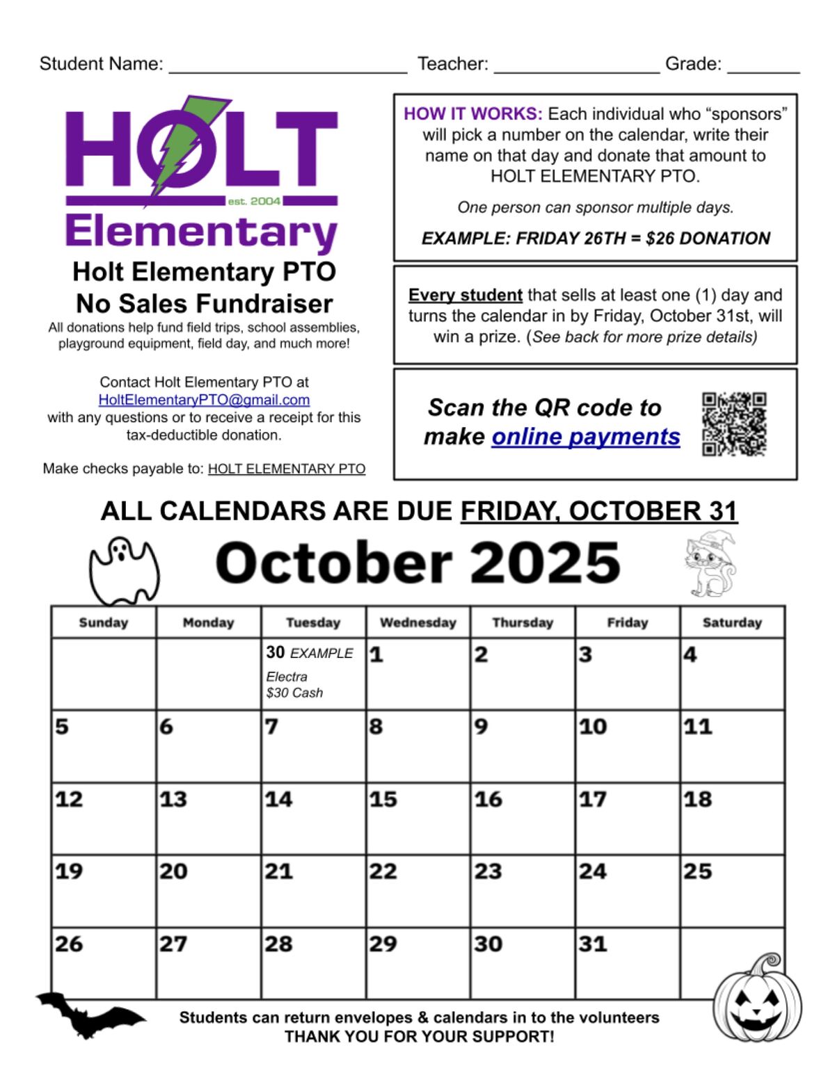 No Sale Calendar Fundraiser: Your student(s) will bring home an October 2025 calendar with instructions and a white envelope. Sell as many days as possible by asking family and friends to sponsor a day (e.g., $8 for October 8). Record sales on the calendar. Turn in calendars and payments by 2:30pm Friday, October 31, to earn prizes announced November 3. More details HERE and below;